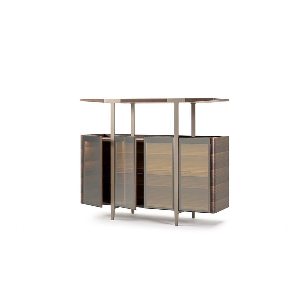 Комод оснащен прочной полкой и закаленным стеклом, обеспечивая надежное место для хранения ваших любимых вещей, книг или декора. Элегантные ножки из нержавеющей стали с бронзовой полировкой придают изделию современный вид и гарантируют устойчивость, создавая гармоничный баланс между стилем и функциональностью.