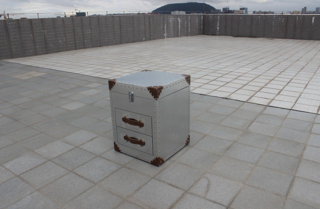 Тумба с декоративными кожаными вставками и металлическими клепками входит в коллекцию Aviator, посвященную легендарному военному самолету Великобритании. Вместо ручек для выдвижных ящиков мы использовали ремешки из натуральной кожи. В зависимости от пожеланий заказчика края и боковые стенки можем оббить кожаными вставками различного цвета. В обустройстве лофтового интерьера мягкая кожа и блестящий металл хорошо сочетаются с кирпичными или бетонными стенами.
