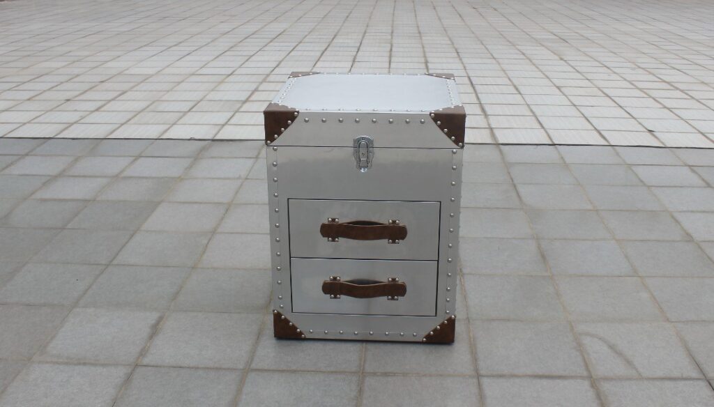 Тумба с декоративными кожаными вставками и металлическими клепками входит в коллекцию Aviator, посвященную легендарному военному самолету Великобритании. Вместо ручек для выдвижных ящиков мы использовали ремешки из натуральной кожи. В зависимости от пожеланий заказчика края и боковые стенки можем оббить кожаными вставками различного цвета. В обустройстве лофтового интерьера мягкая кожа и блестящий металл хорошо сочетаются с кирпичными или бетонными стенами.