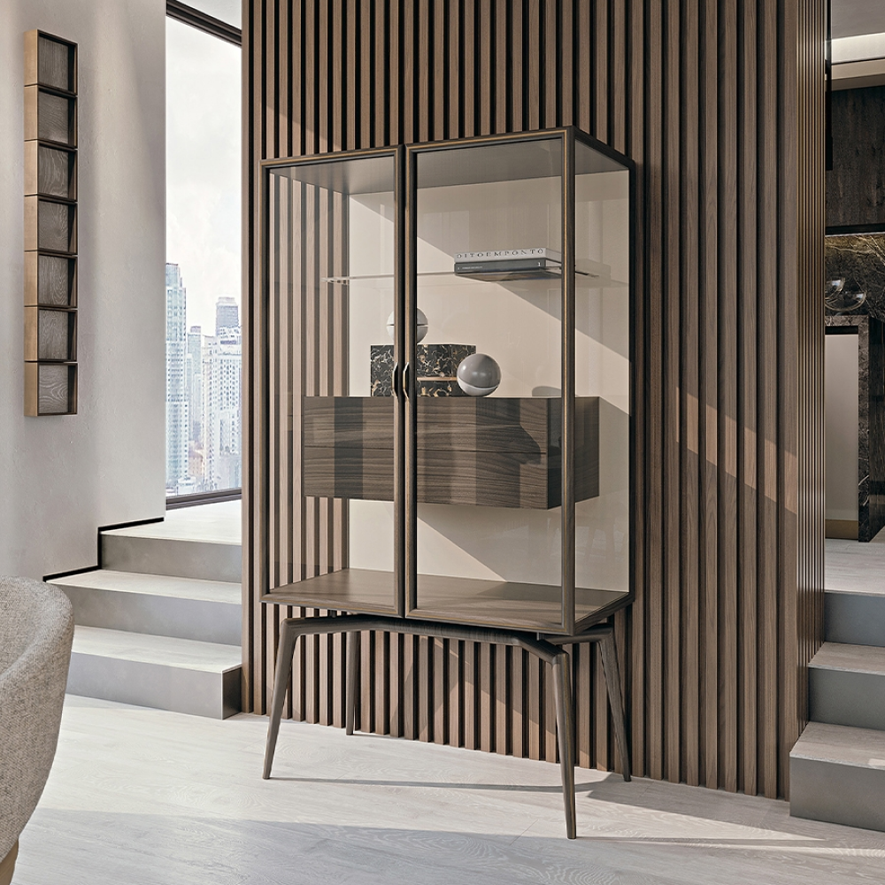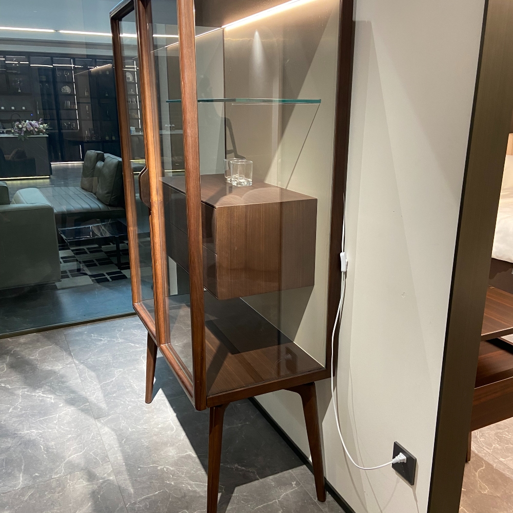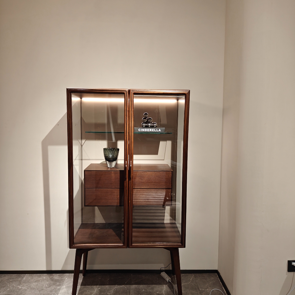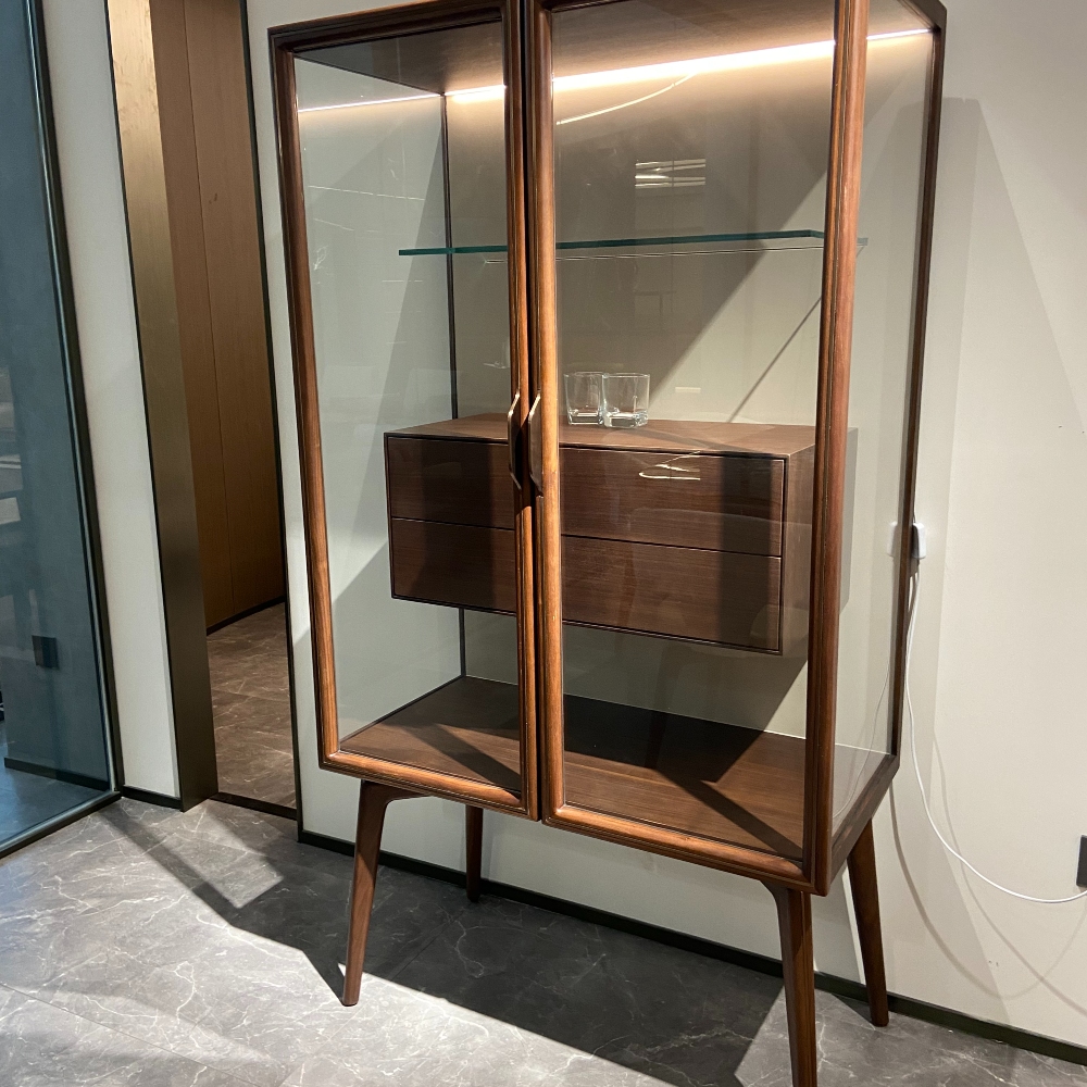 — Премиальный материал: Витрина изготовлена из натурального орехового шпонa и массива орехового дерева, что обеспечивает ей долговечность и впечатляющую текстуру.